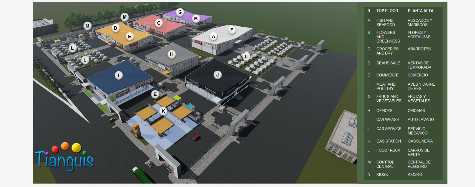 Ennie Market Concept• ENNIE MARKET is an investment project which supplies several districts, concentrating a wide variety of products and services. • It is developed on a land with an area of 14 acres (580,152 Sqft, 53,898 m2) conformed by 7 buildings that concentrate similar businesses, among them: flowers and vegetables, food, groceries, automotive service, offices; generating competition and benefit for consumers. • It is a wide and colorful place, with the capacity to receive large quantities of supplies and different types of public, from families to suppliers. Concepto del Ennie Market