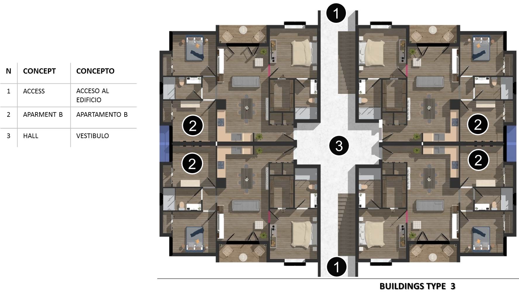 Tipo 2 incluye 8 apartamentos tipo A y 8 apartamentos tipo B.