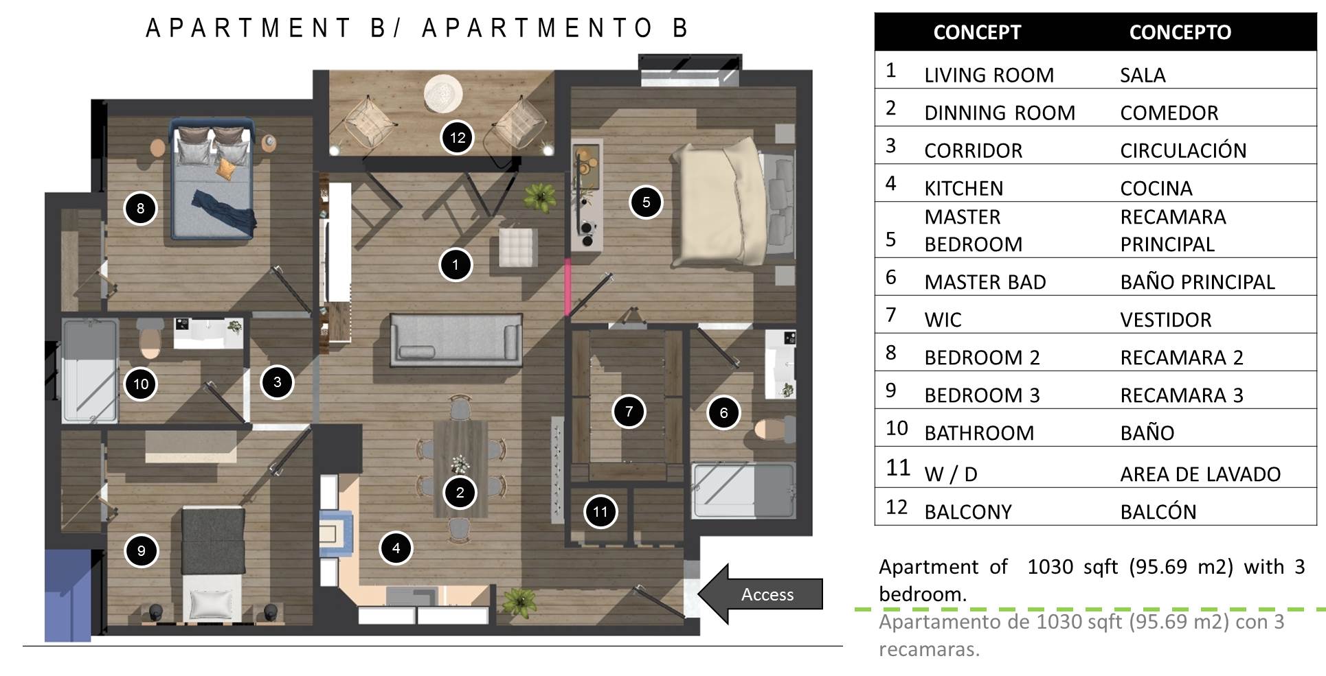 Apartments Type BThe facades of the buildings have terraces for the contemplation and recreation of the users, ventilation of the spaces and views to the outside. Apartment B has large integrated spaces and includes 3 bedrooms and 2 bathrooms. |