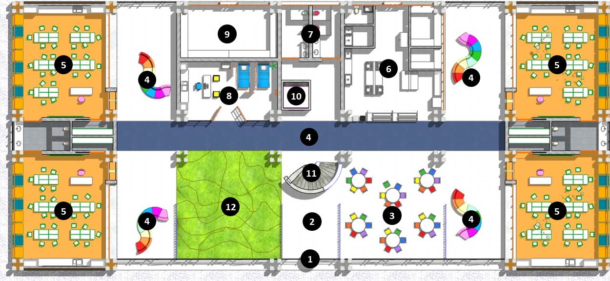 | 4 | HALL | CIRCULACION | 8 | NURSING | ENFERMERIA | 12 | RECREATION | RECREACION |