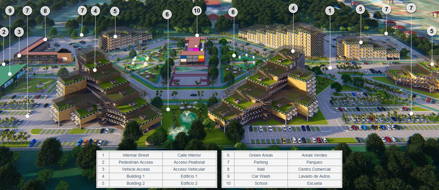 General DescriptionCENTRAL PARK PR is a complex of mixed uses with housing, recreation and educational buildings; has for purpose to créate a community around the daily activities of its inhabitants. The Project consists of a property of approximately 20 acres, with a rectangular geometry, revolves around the central park and is surrounded by a perimeter street, with traffic in one direction, counterclockwise and divided by intermediate streets. There are parking areas for owners and visitors, a bicycle path; in addition to a walk for hiking, pedestrian areas, contemplative gardens, sports fields and different recreation areas for its inhabitants. • THE GREEN TERRACED CEILINGS of the residential buildings bring dynamism and freshness to the design and to the comprehensive view of the complex. • ACCESS. From the main entrance, the project is accessed through a single 4-lane two-way street, on the sides of which is an area dedicated to a shopping plaza where businesses such as boutiques, coffee, restaurant, gym, spa, aesthetics, etc. will be housed; and on the other side is the Car Wash and a children's play area. • THE PARK. It is set out in a distribution surrounding an immense park / lung where it is proposed to locate recreational green areas divided into three tree-themed portions. A basic education school (Kinder Garden, Elementary School and High School) has been located in this area for a total of 200 students in the three educational levels. • ECOLOGICAL PROJECT. The project is considered eco friendly as it aims to create abundant vegetation, to promote a healthy and pleasing environment. In addition, it is proposed as a “smokers free” project, free of smokers. • LIVING PLACE. The complex has 288 apartments with two and three bedrooms, in a total of 6 terraced buildings with five and eight floors; Includes 576 for owners and 58 for visitors. |